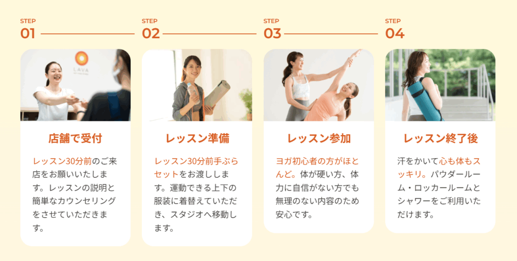 - ウェア・タオル・マットはレンタル可能 → 手ぶらで通える